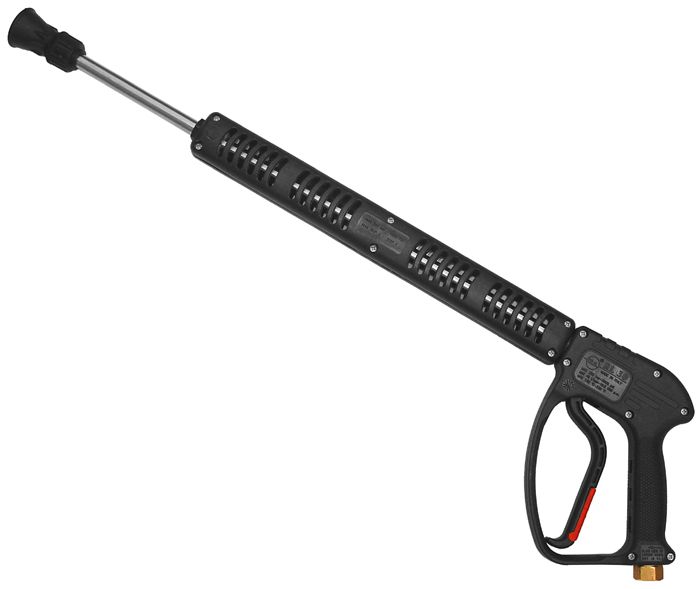 Pistola de hidrojato com corpo forjado. O mecanismo de aço inoxidável garante alto desempenho e durabilidade. O design ergonômico reduz o esforço ao usar a pistola e protege a mão do operador. A alavanca está equipada com uma trava de segurança para evitar operações inadvertidas.